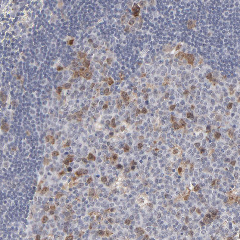 Immunohistochemical staining of human testis shows moderate cytoplasmic positivity in a subset of cells in seminiferous ducts.