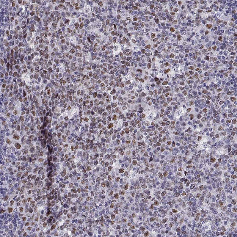 Immunohistochemical staining of human testis shows moderate nuclear and cytoplasmic positivity in cells in seminiferous ducts.