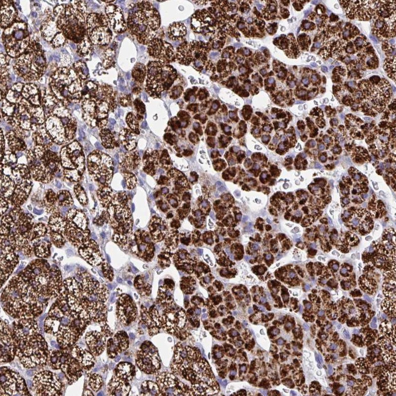 Immunohistochemistry analysis in human adrenal gland and liver tissues using Anti-BCAT2 antibody. Corresponding BCAT2 RNA-seq data are presented for the same tissues.