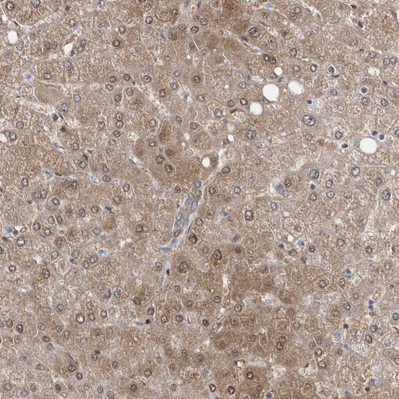 Immunohistochemical staining of human duodenum shows moderate to strong cytoplasmic positivity in glandular cells.