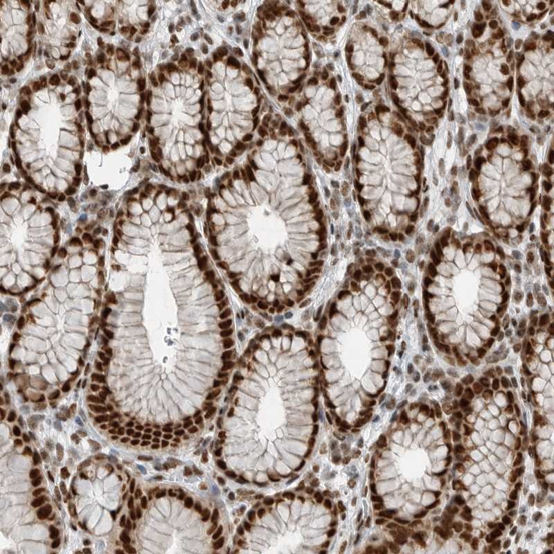 Immunohistochemical staining of human stomach shows strong nuclear positivity in glandular cells.
