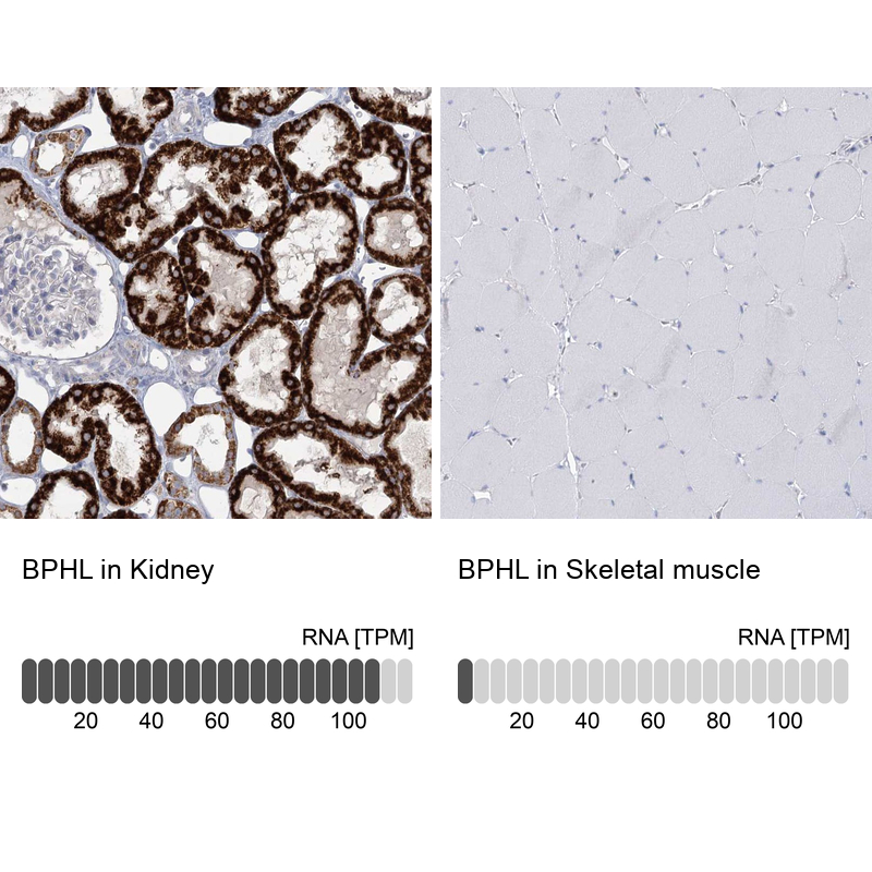 Immunohistochemistry analysis in human kidney and skeletal muscle tissues using Anti-BPHL antibody. Corresponding BPHL RNA-seq data are presented for the same tissues.