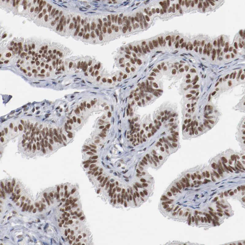 Immunohistochemical staining of human testis shows strong nuclear positivity in cells in seminiferous ducts.