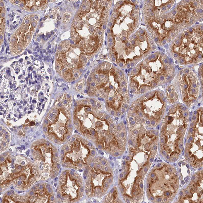 Immunohistochemical staining of human cerebral cortex shows moderate cytoplasmic positivity in neuronal cells.