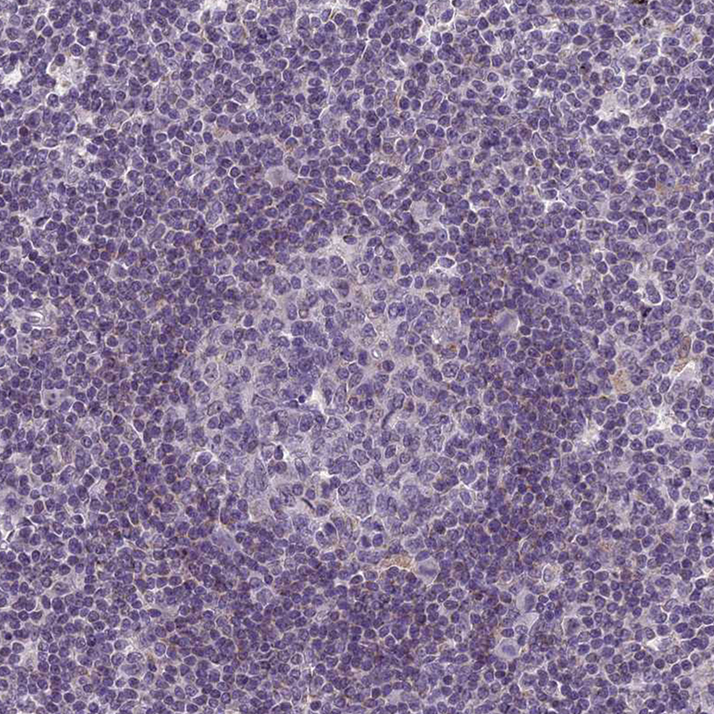Immunohistochemical staining of human duodenum shows moderate cytoplasmic positivity in glandular cells.