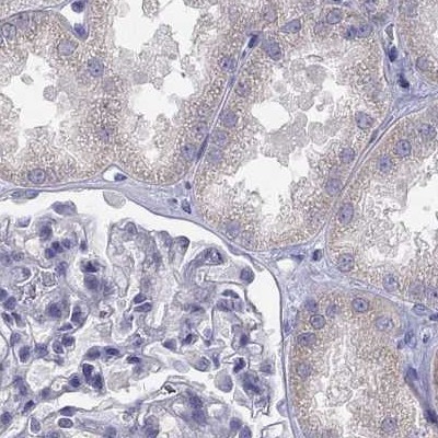 Immunohistochemical staining of human colon, kidney, testis and thyroid gland using Anti-C16orf89 antibody HPA016934 (A) shows similar protein distribution across tissues to independent antibody HPA013613 (B).