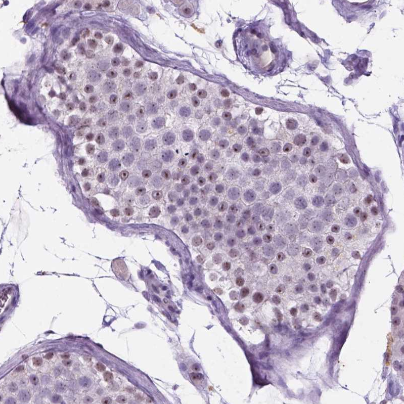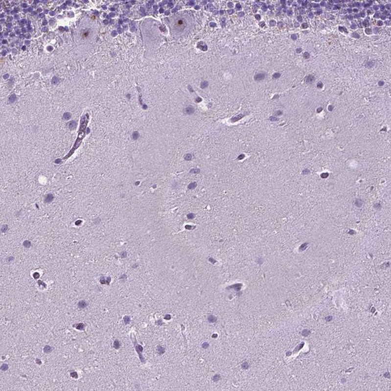 Immunohistochemical staining of human cerebral cortex shows moderate nucleoli positivity in neuronal cells.