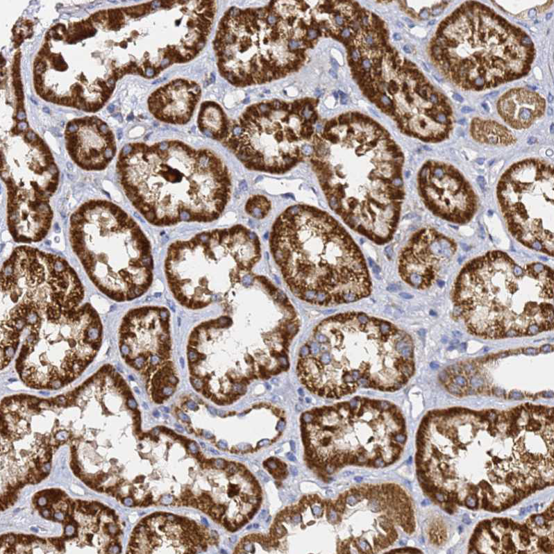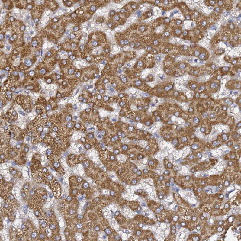 Immunohistochemical staining of human adipose tissue shows strong granular cytoplasmic positivity in adipocytes.