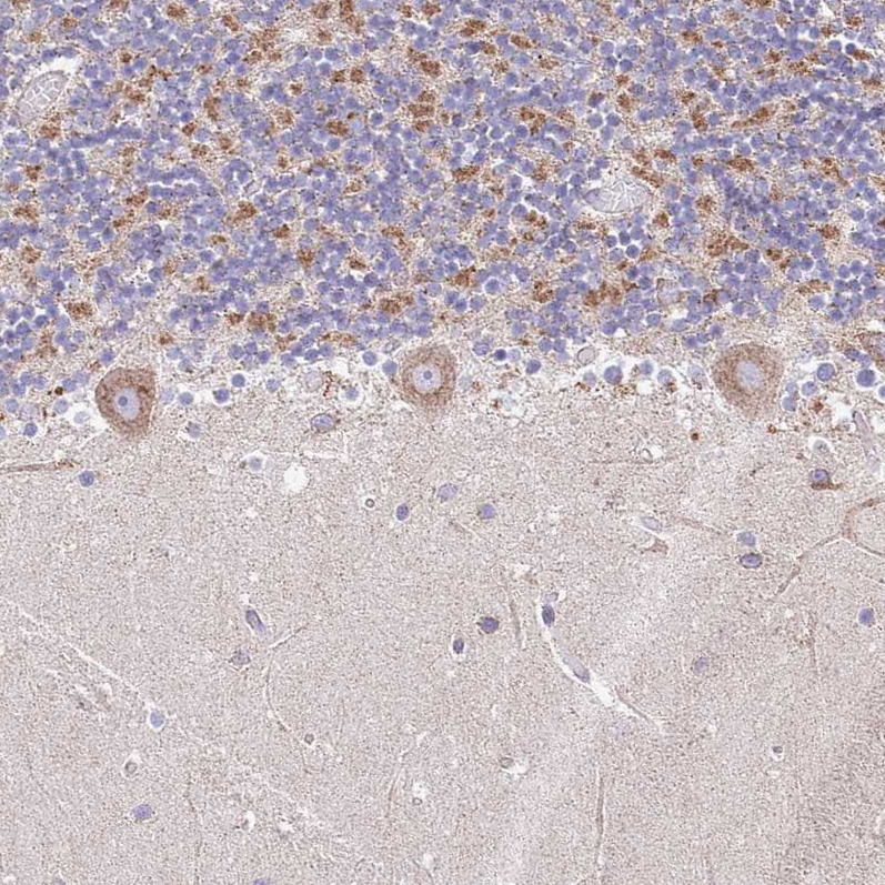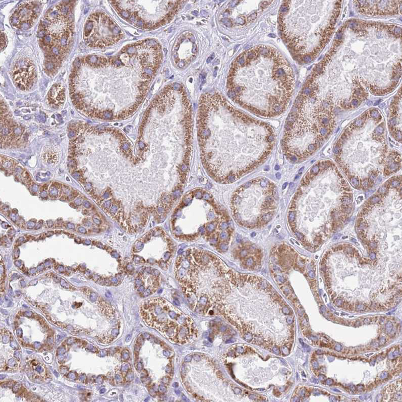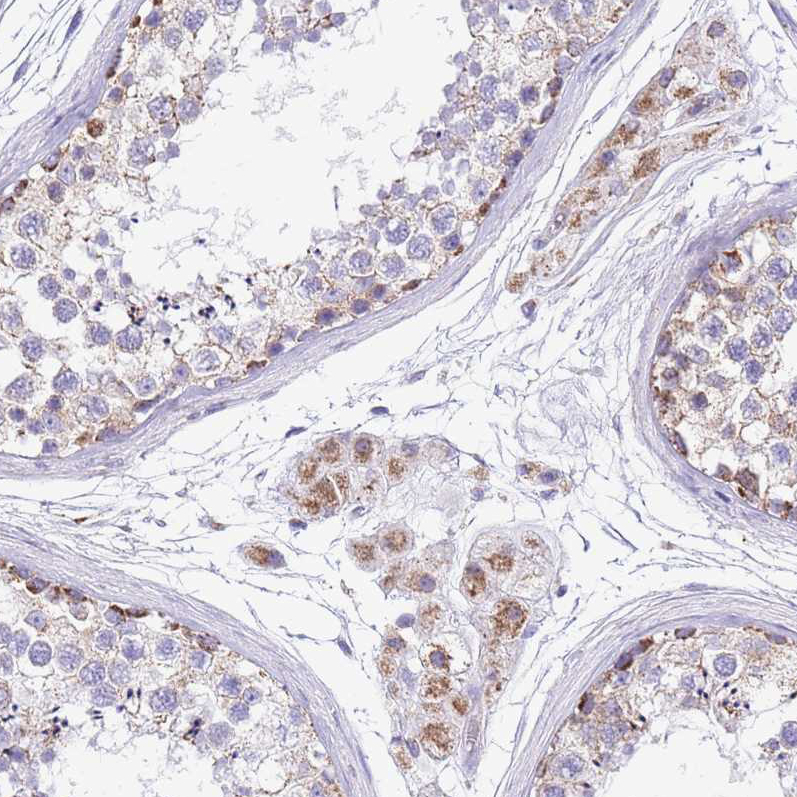 Immunohistochemical staining of human testis shows strong granular cytoplasmic positivity in Leydig cells.