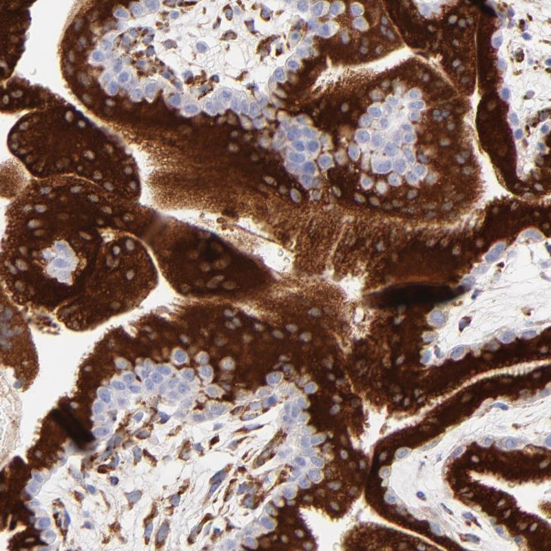 Immunohistochemistry analysis in human placenta and prostate tissues using Anti-C1QTNF6 antibody. Corresponding C1QTNF6 RNA-seq data are presented for the same tissues.