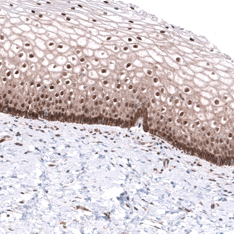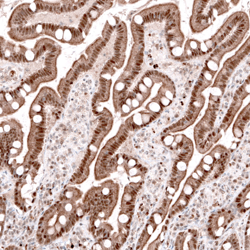 Immunohistochemical staining of human testis shows moderate to strong nuclear positivity in cells in seminiferous ducts.