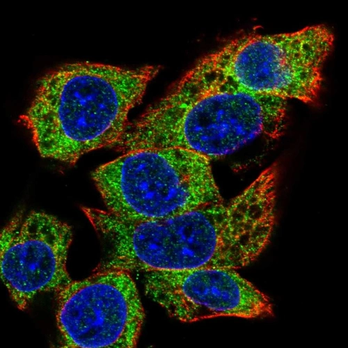 Immunofluorescent staining of human cell line Hep G2 shows localization to endoplasmic reticulum.