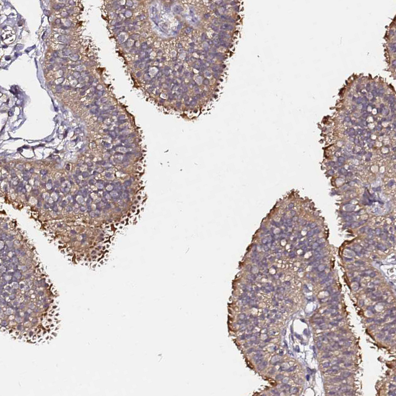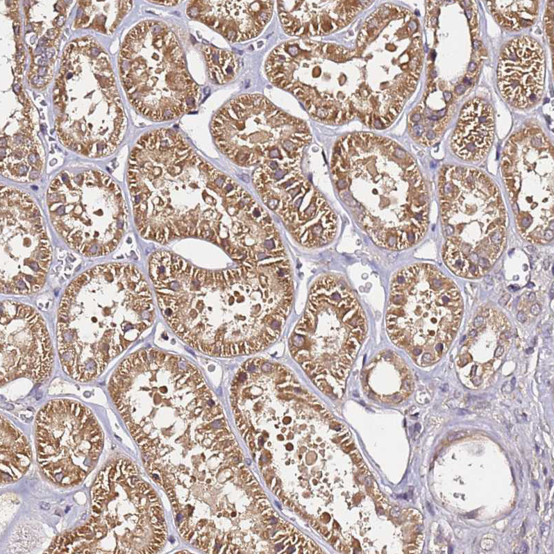 Immunohistochemical staining of human gastrointestinal shows strong cytoplasmic positivity in glandular cells.