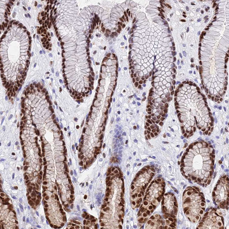 Immunohistochemical staining of human pancreas shows strong nuclear positivity in exocrine glandular cells.