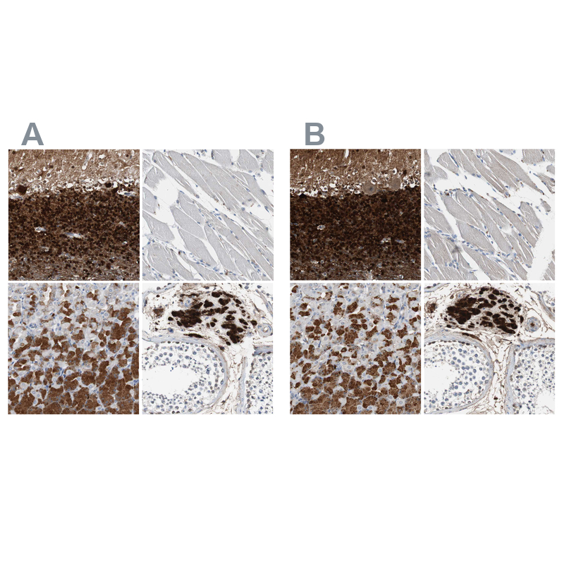 Immunohistochemistry analysis in human testis and skeletal muscle tissues using HPA007306 antibody. Corresponding CALB2 RNA-seq data are presented for the same tissues.