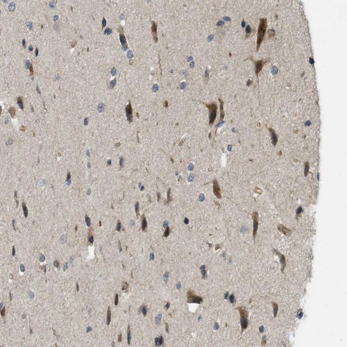 Immunohistochemical staining of human cerebral cortex shows cytoplasmic positivity in neurons.