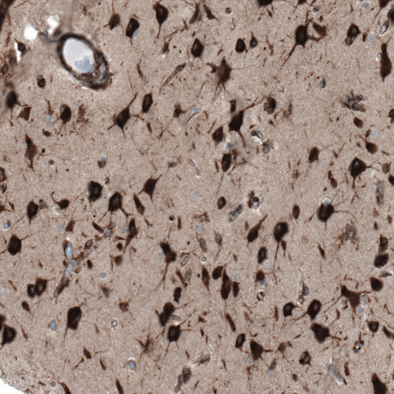 Immunohistochemical staining of human testis shows strong cytoplasmic positivity in cells in seminiferous ducts.