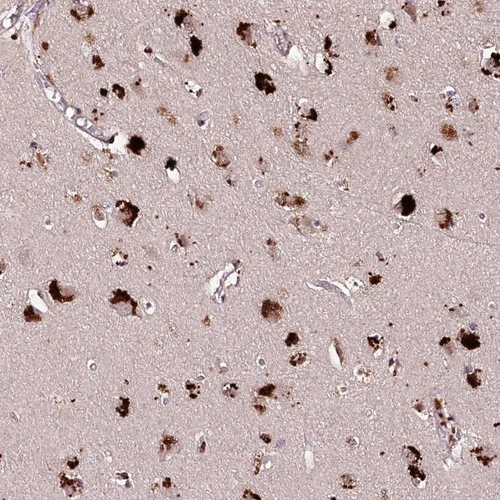 Immunohistochemical staining of human cerebral cortex shows strong cytoplasmic positivity in neuronal cells.