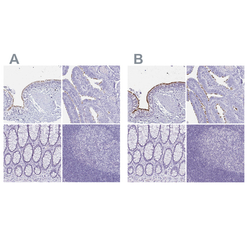 Immunohistochemical staining of human bronchus, fallopian tube, rectum and tonsil using Anti-CCDC39 antibody HPA035363 (A) shows similar protein distribution across tissues to independent antibody HPA035364 (B).