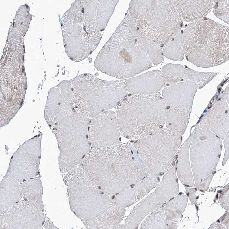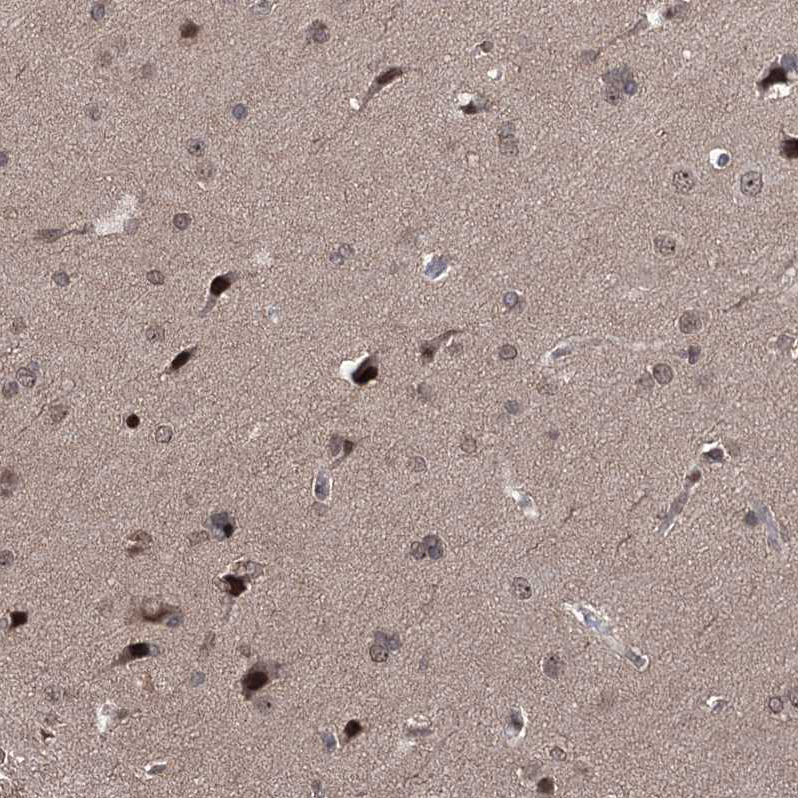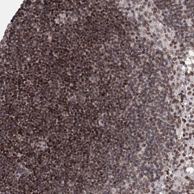 Immunohistochemical staining of human testis shows moderate nuclear and cytoplasmic positivity in cells in seminiferous ducts.