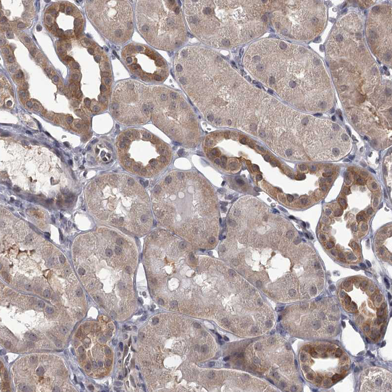 Immunohistochemical staining of human cerebral cortex shows strong cytoplasmic positivity in neuronal cells and moderate in neuropil.