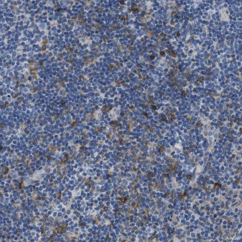 Immunohistochemical staining of human colon shows strong membranous-cytoplasmic positivity in lymphoid cells.