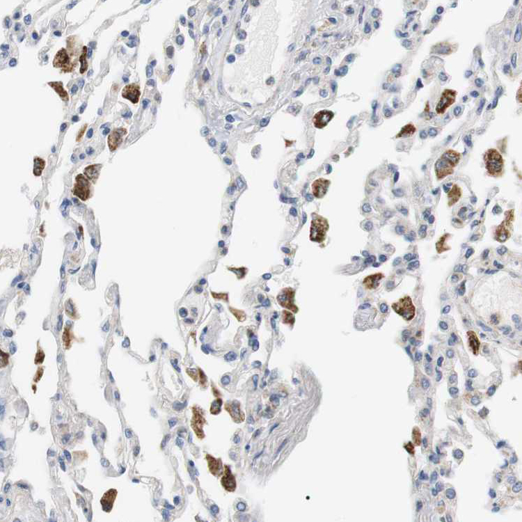 Immunohistochemical staining of human bone marrow shows moderate cytoplasmic positivity in subsets of hematopoietic cells.