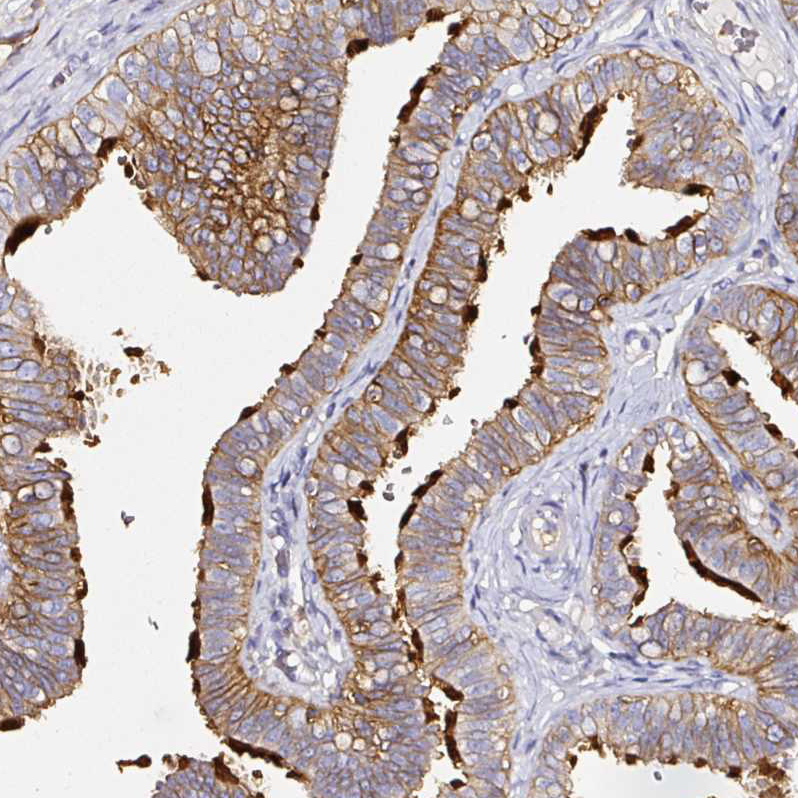 Immunohistochemical staining of human prostate shows moderate membranous positivity in glandular cells.