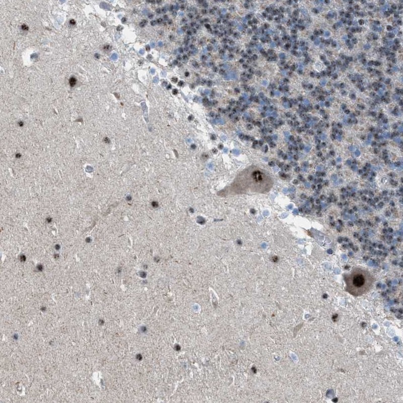 Immunohistochemical staining of human cerebellum shows strong nuclear positivity in purkinje cells.