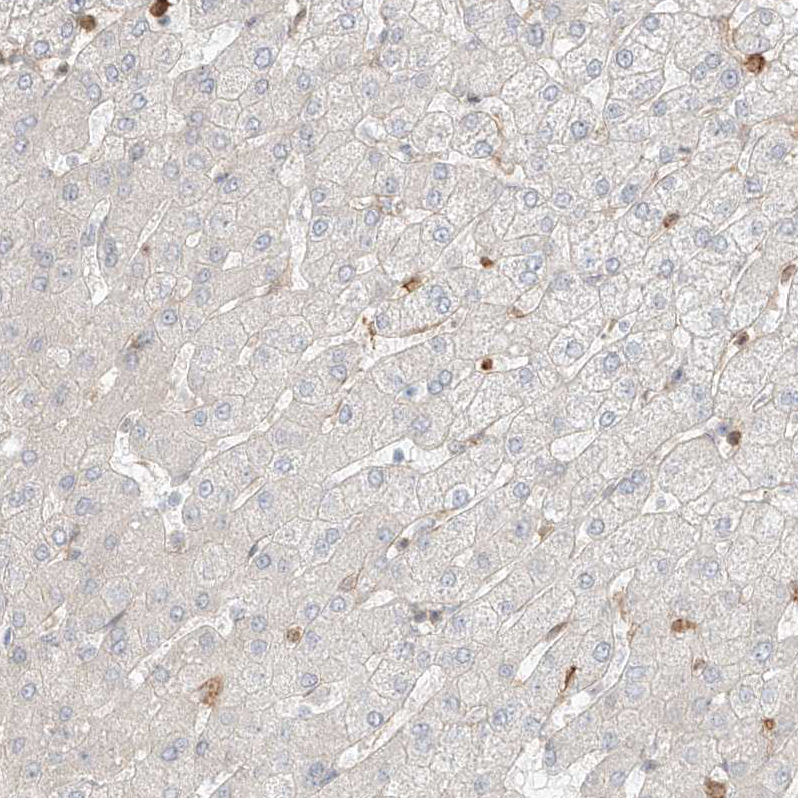 Immunohistochemical staining of human testis shows moderate cytoplasmic positivity in cells in seminiferous ducts, as well as nuclear positivity in a subset of cells.
