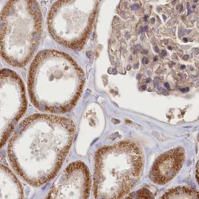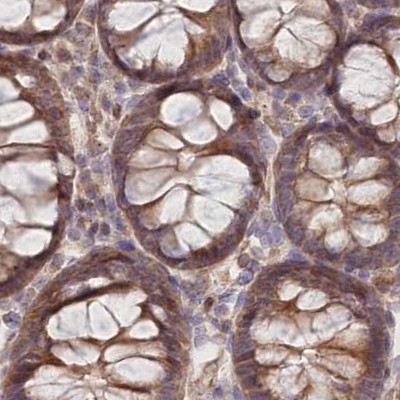 Immunohistochemical staining of human colon, kidney, liver and testis using Anti-CEP70 antibody HPA036941 (A) shows similar protein distribution across tissues to independent antibody HPA036942 (B).