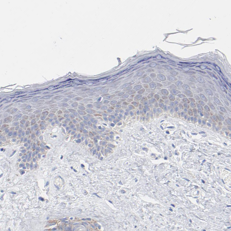 Immunohistochemistry analysis in human skeletal muscle and skin tissues using HPA003440 antibody. Corresponding CHCHD10 RNA-seq data are presented for the same tissues.