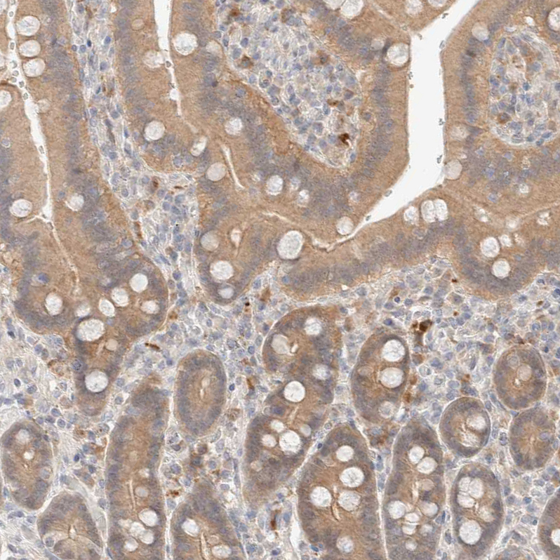 Immunohistochemical staining of human testis shows weak to moderate positivity in cells in seminiferous ducts.