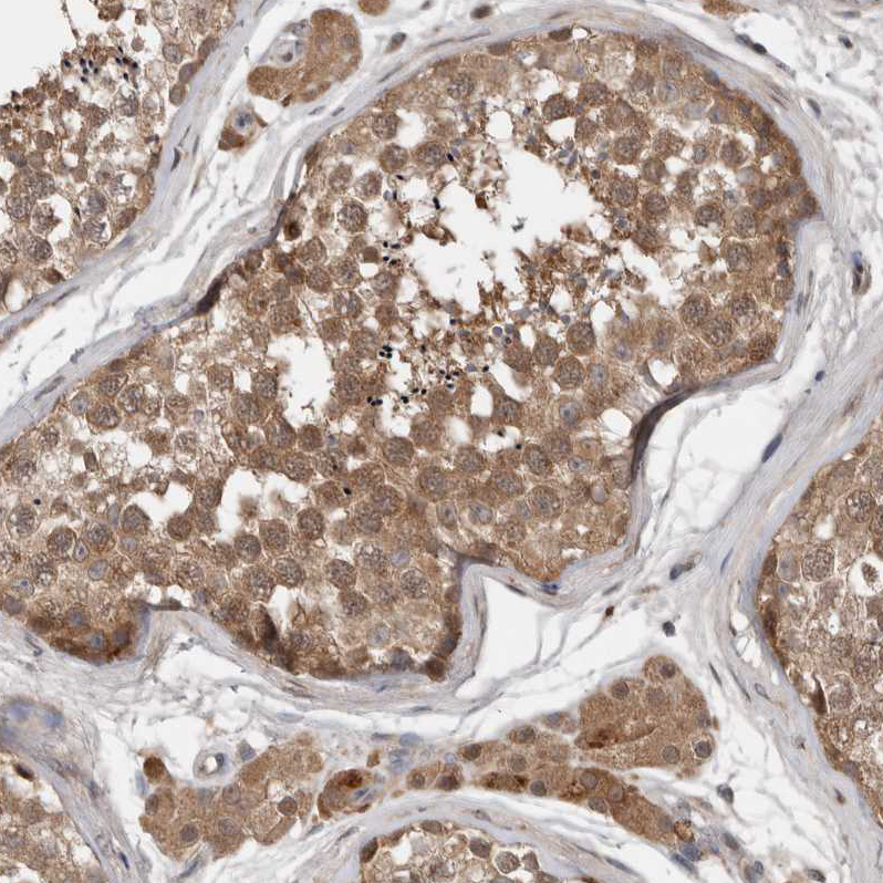 Immunohistochemical staining of human Placenta shows moderate cytoplasmic positivity in trophoblastic cells.