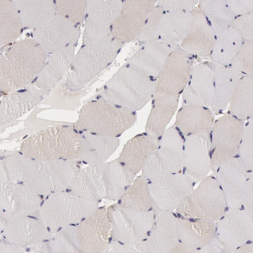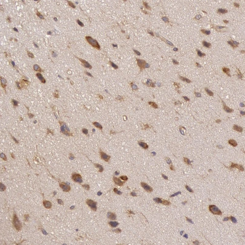 Immunohistochemical staining of human kidney shows moderate cytoplasmic positivity in cells in tubules.