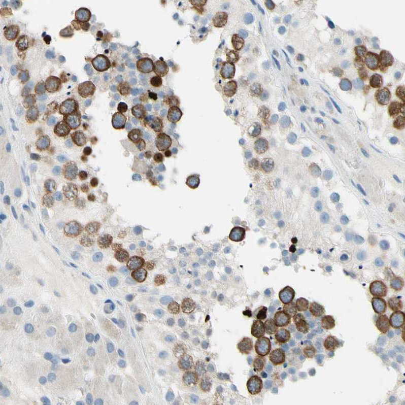 Immunohistochemistry analysis in human testis and pancreas tissues using HPA008410 antibody. Corresponding CKAP2 RNA-seq data are presented for the same tissues.
