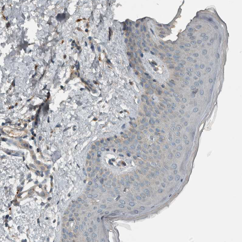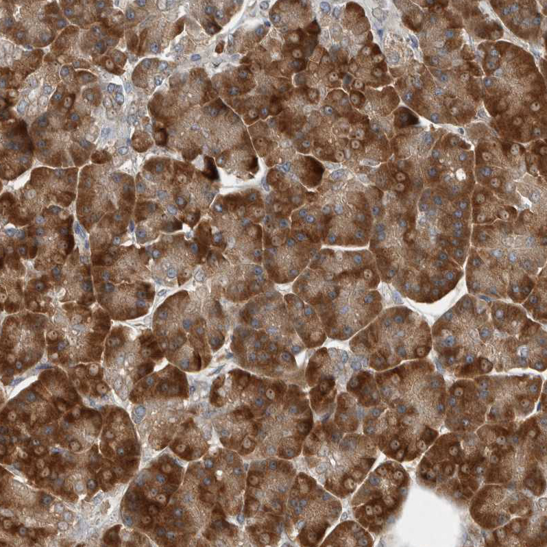 Immunohistochemical staining of human duodenum shows moderate granular cytoplasmic positivity in glandular cells.