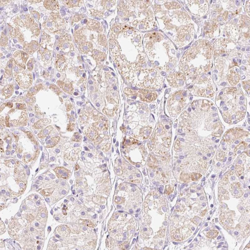 Immunohistochemical staining of human cerebral cortex shows strong granular pattern cytoplasmic positivity in neuronal cells.