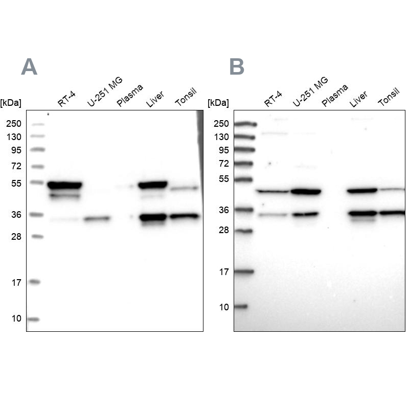 Immunohistochemical staining of human gastrointestinal, kidney, liver and lung using Anti-CLYBL antibody HPA040691 (A) shows similar protein distribution across tissues to independent antibody HPA039959 (B).