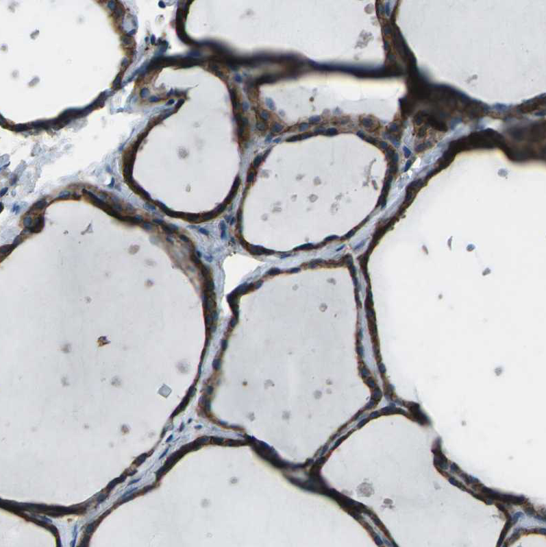 Immunohistochemistry analysis in human thyroid gland and liver tissues using HPA014704 antibody. Corresponding CMTM4 RNA-seq data are presented for the same tissues.