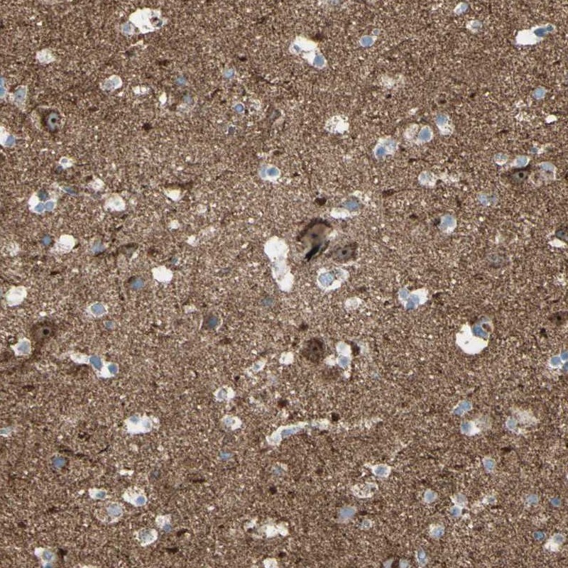 Immunohistochemical staining of human cerebral cortex shows strong cytoplasmic and nucleolar positivity in subset of neuronal cells, neuropil was distinctly stained.
