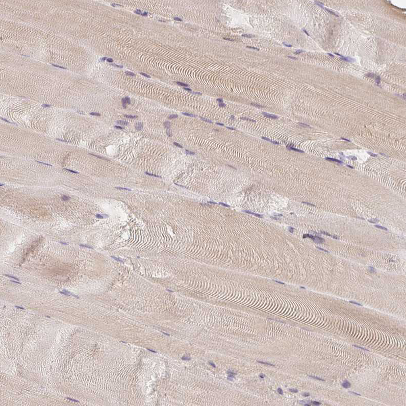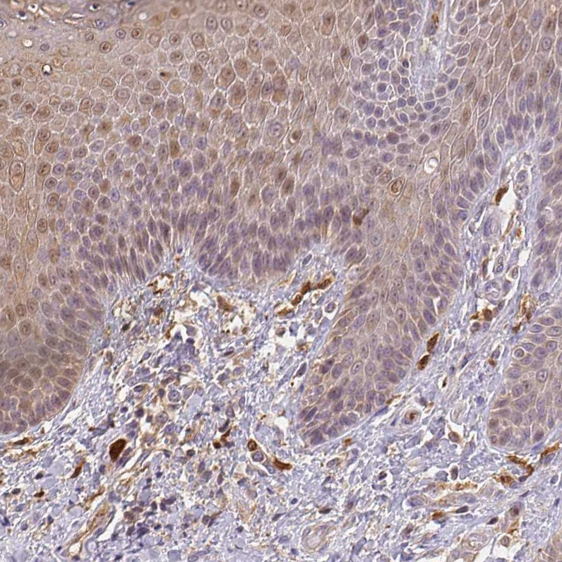 Immunohistochemical staining of human testis shows moderate cytoplasmic positivity in cells in seminiferous ducts.