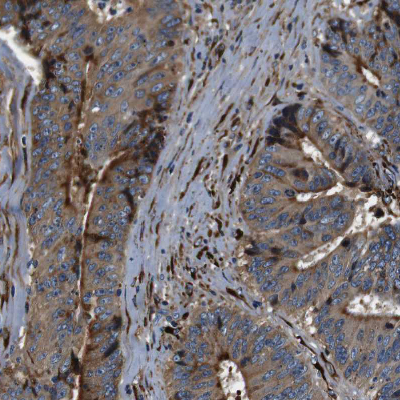 Immunohistochemical staining of human colon shows moderate positivity in extracellular matrix.