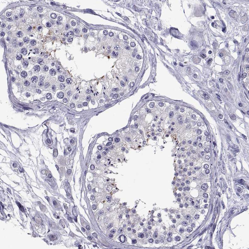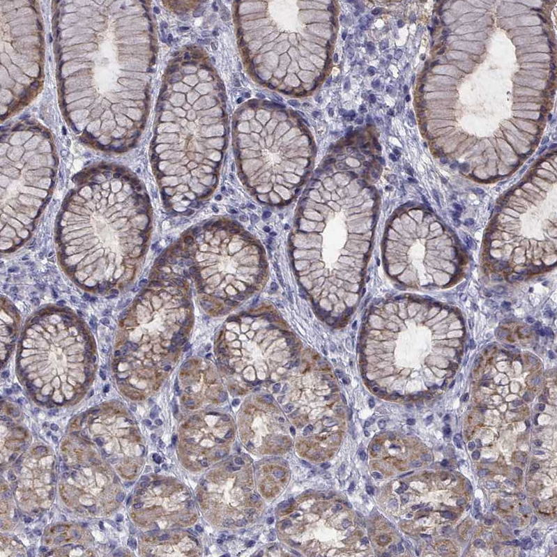 Immunohistochemical staining of human pituitary gland shows moderate cytoplasmic positivity in a subset of glandular cells.