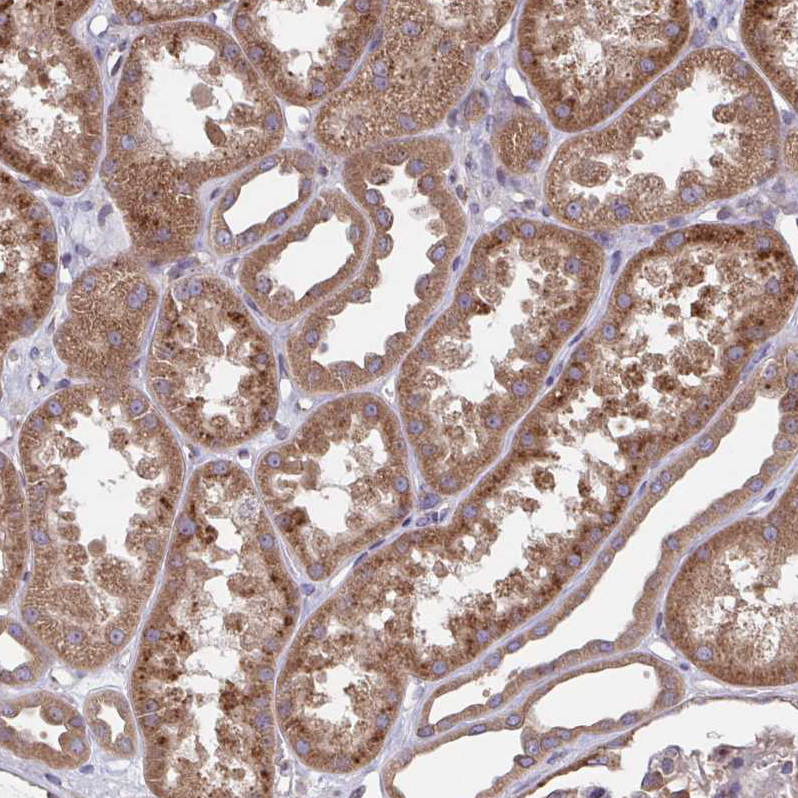 Immunohistochemical staining of human liver shows moderate granular cytoplasmic positivity in hepatocytes.
