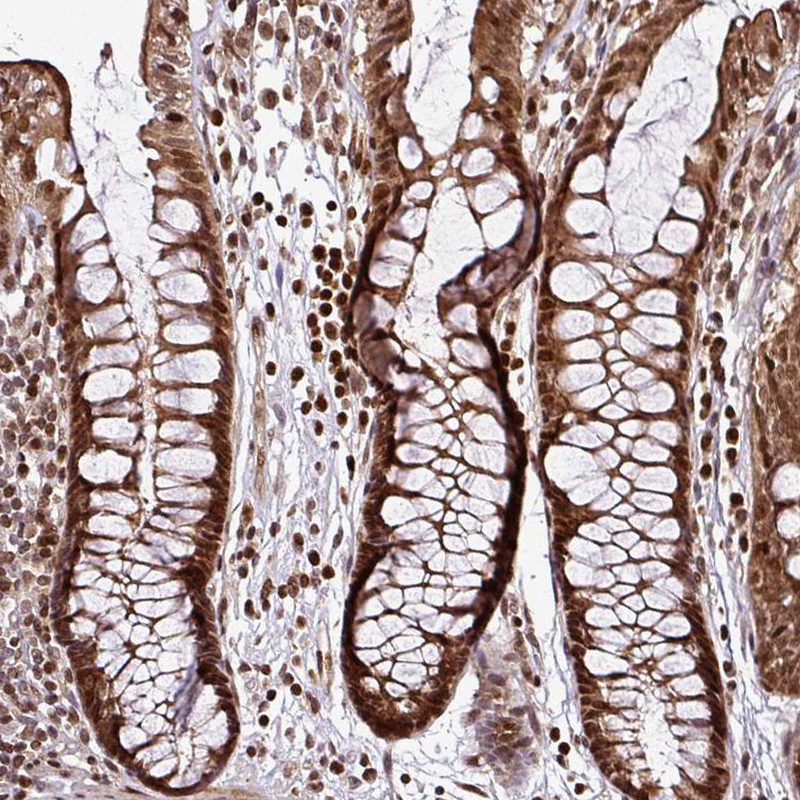 Immunohistochemical staining of human testis shows strong nuclear positivity in cells in seminiferous ducts.
