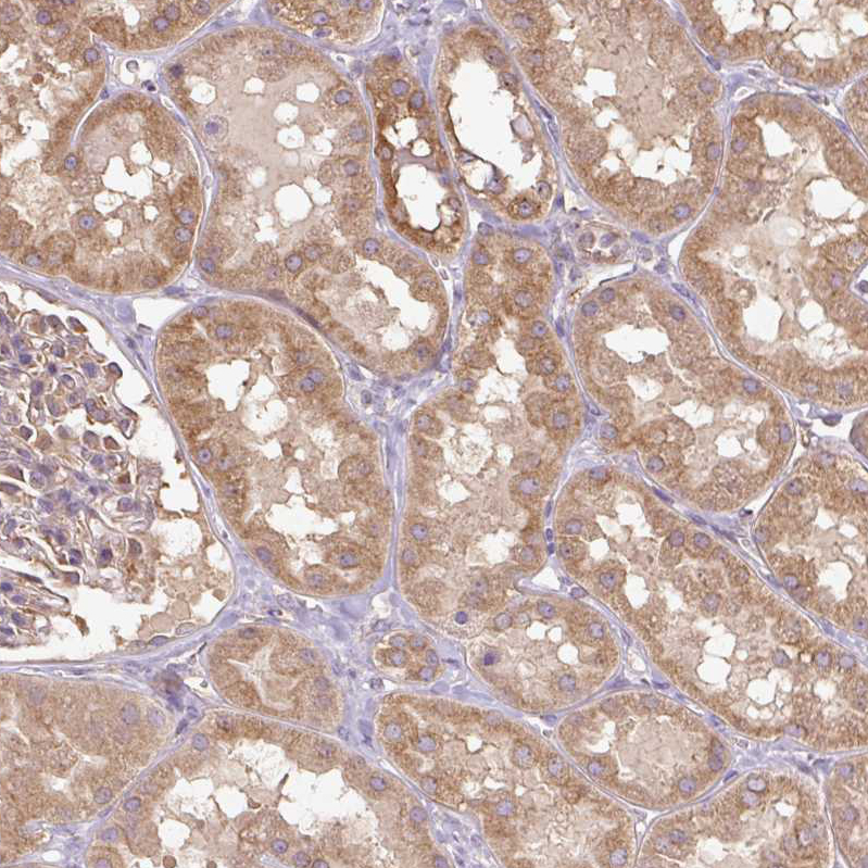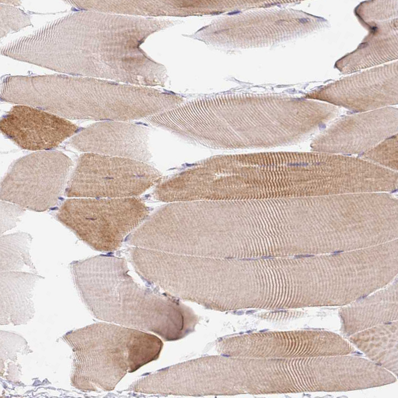 Immunohistochemical staining of human skeletal muscle shows moderate cytoplasmic positivity in myocytes.