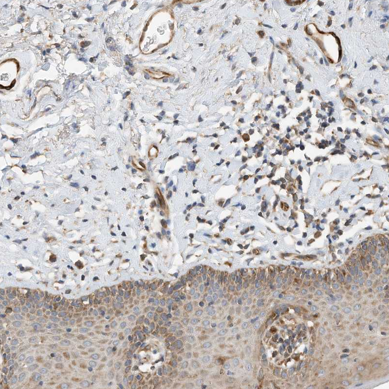 Immunohistochemical staining of human prostate shows moderate cytoplasmic positivity in glandular cells.