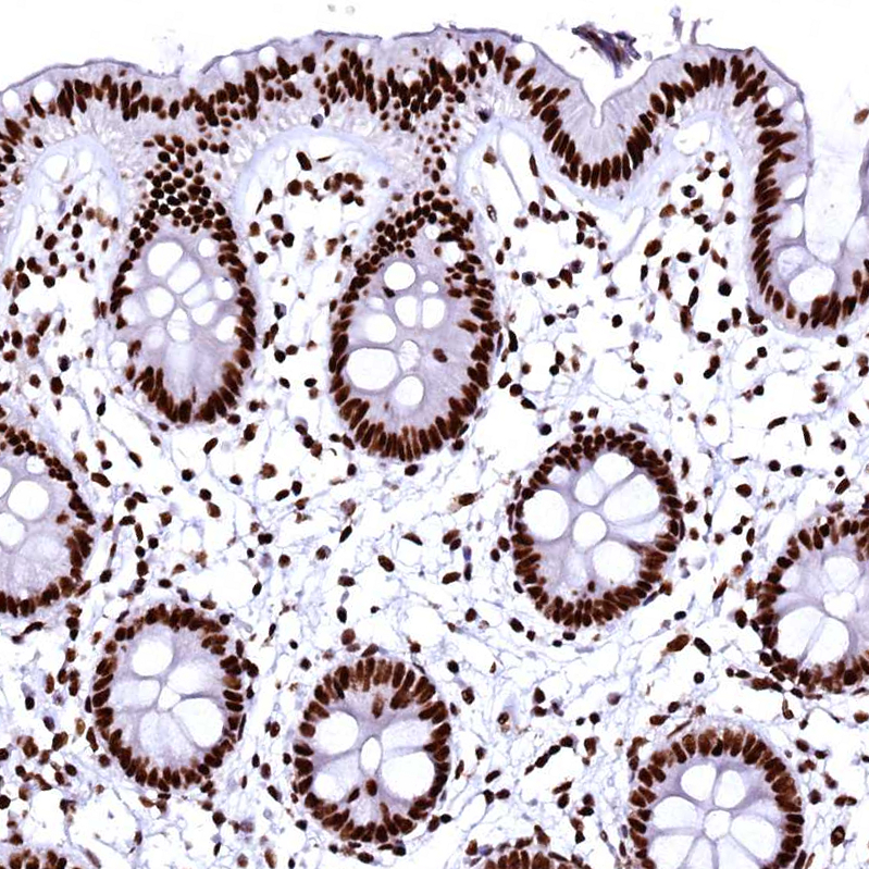Immunohistochemical staining of human lymph node shows strong nuclear positivity in lymphoid cells.