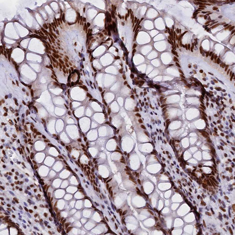 Immunohistochemical staining of human testis shows strong nuclear positivity in cells in seminiferous ducts.